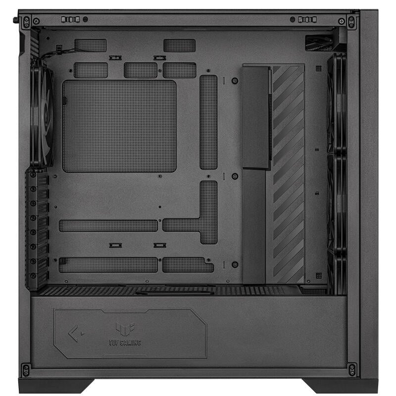 ეს არის airflow-ზე აგებული TUF სერიის ქეისი — ანუ არა “ვიტრინა”, არამედ ცივი და პრაქტიკული gaming case.