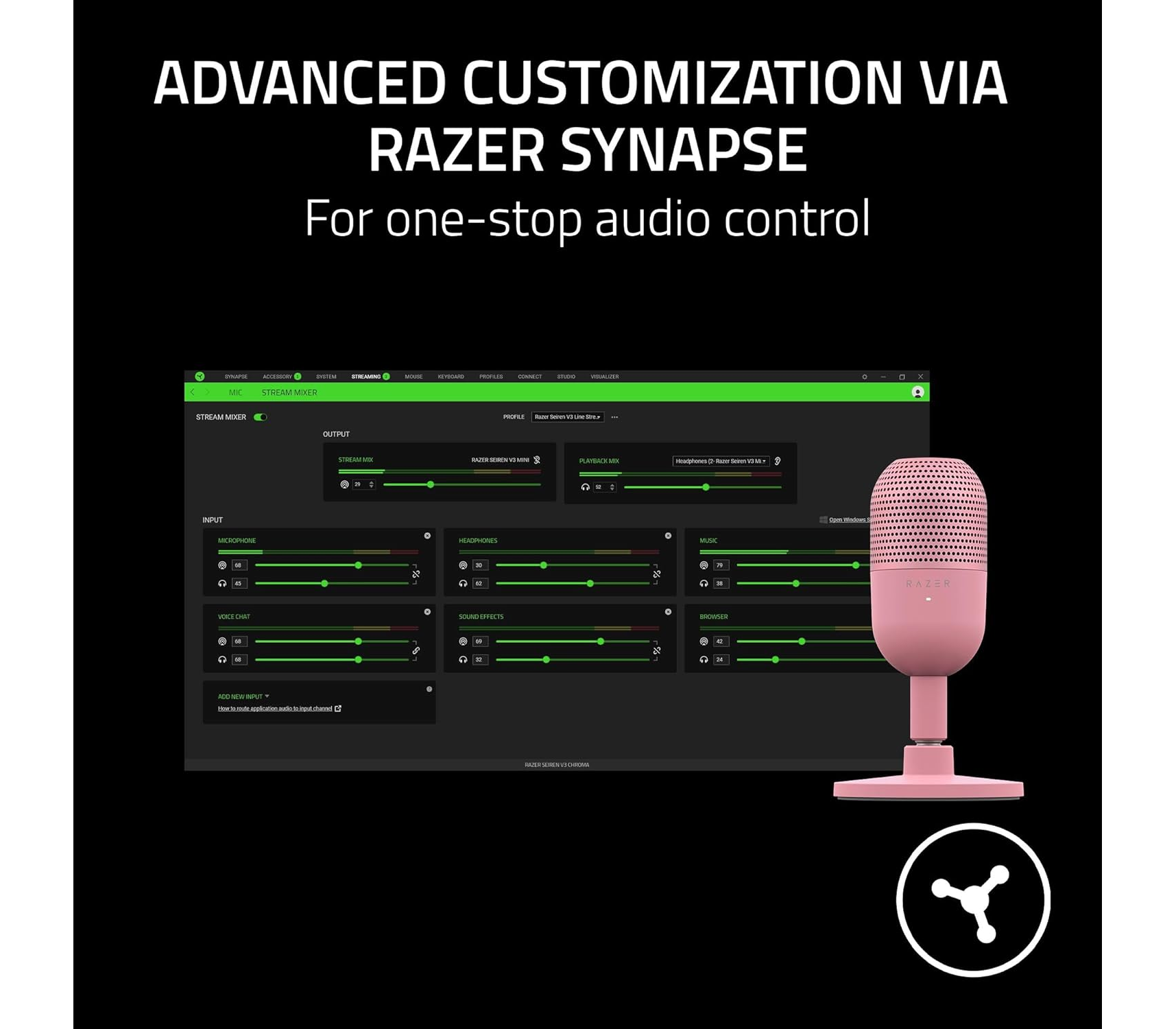 Razer Synapse მხარდაჭერა — ხმის კონტროლი და ოპტიმიზაცია პროფესიული ხარისხისთვის.