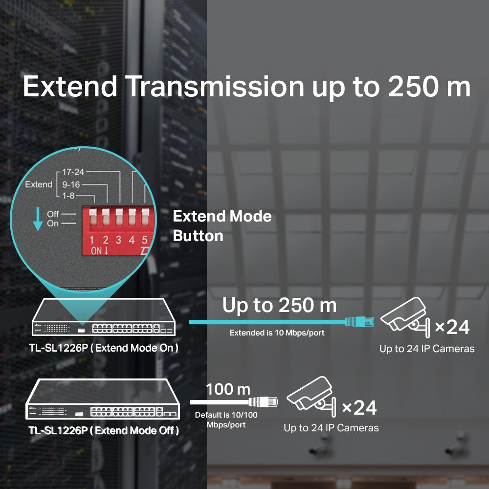 გაფართოების რეჟიმი (250 მ-მდე PoE კვების წყარო და მონაცემთა გადაცემა)