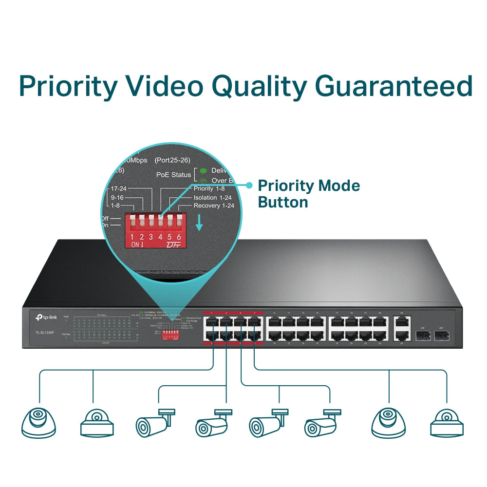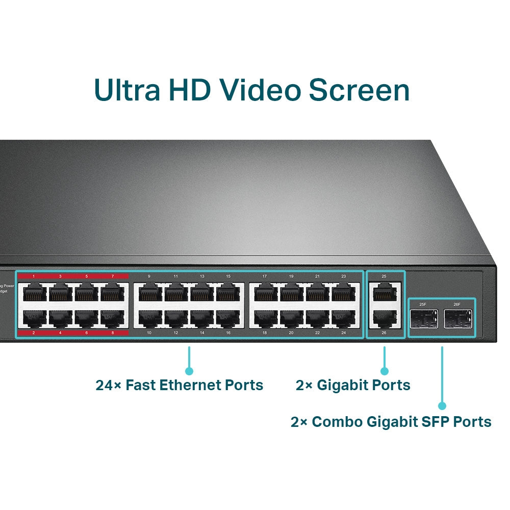 24× PoE+ 10/100 Mbps RJ45 პორტები