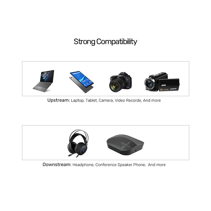 უზრუნველყოფს კრისტალურად სუფთა აუდიო გადაცემას და მშვენივრად მუშაობს მიკროფონის და დესკტოპის / ლეპტოპის აუდიოსთვის.